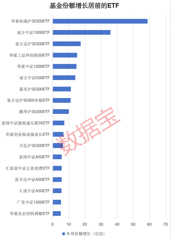具体到单只基金,59只etf份额增长超1亿份,18只增长超5亿份。其中,华泰柏瑞沪深300etf增长居首,多达58.78亿份;南方中证1000etf排在第二位,增加35.76亿份;易方达沪深300etf、华夏上证科创板50etf、华夏中证1000etf等7只etf随后,份额增量均在10亿份以上。