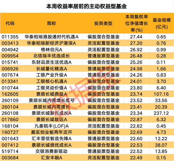 周涨幅居前的华泰柏瑞港股通时代机遇a和华泰柏瑞新经济沪港深a均由何琦管理,两只基金主要投资于港股。根据基金中报,华泰柏瑞港股通时代机遇a持有了多家金融及地产股票,基金前三大重仓股东方证券、中国太平、中国银河本周分别上涨30.49%、22.84%、40.94%;持有的地产股绿城中国、越秀地产等,涨幅也均超过35%。