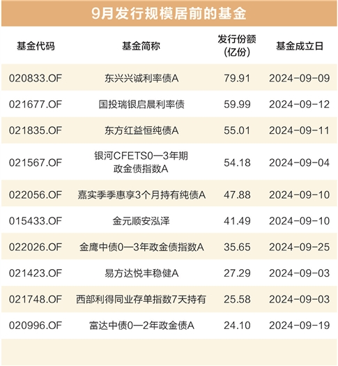 从爆款产品来看,9月有4只新基金首发规模超过50亿元,均为债券型基金,分别为东兴兴诚利率债a、国投瑞银启晨利率债、东方红益恒纯债a、银河cfets0—3年期政金债指数a。此外,嘉实季季惠享3个月持有纯债a、金元顺安泓泽、金鹰中债0—3年政金债指数a、易方达悦丰稳健a、西部利得同业存单指数7天持有、富达中债0—2年政金债a发行规模均超20亿元。首批10只中证a500etf也全部成立,也均完成了20亿元的募集上限。