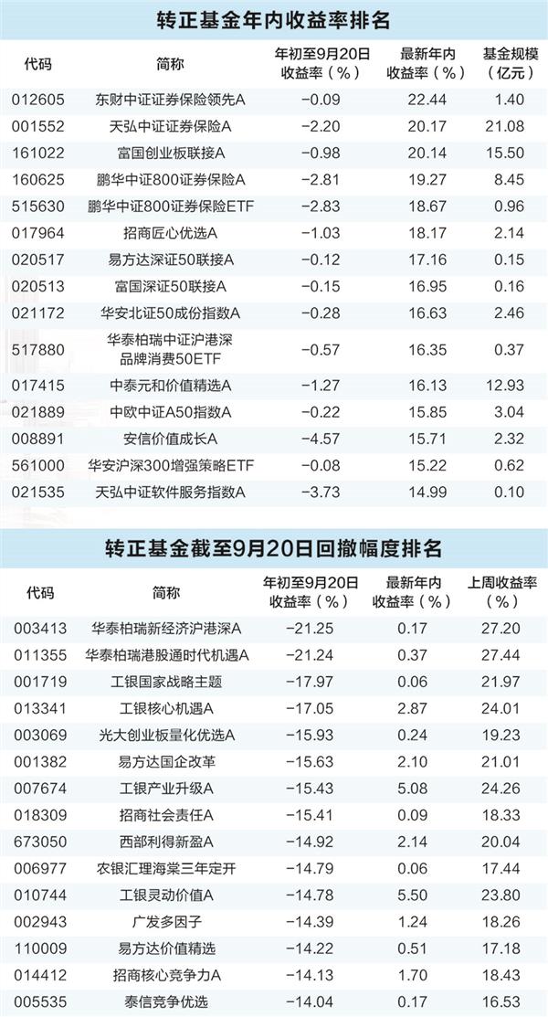 灵活配置型基金收益率转正的也不少,有364只,占比15.93%,其中有40只基金年初至9月20日收益率在-10%以上,比如华泰柏瑞新经济沪港深a,截至9月20日的收益率为-21.25%,最新收益率上升为0.17%,已实现转正,其重仓的主要以港股券商股为主,包括中国银河、中金公司、东方证券,其中中金公司h股上周涨幅达到50.12%,东方证券涨幅达到30.49%。