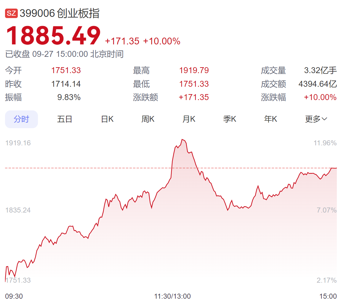 继白酒、新能源等板块持续飙升后,9月27日,中国股市迎来了一个历史性的时刻。创业板指数在当日盘中涨超11%,创下历史最大盘中涨幅,一次次攀升不断展示着市场的强劲动力和投资者对未来的乐观预期。上涨趋势能否持续?此时该追吗?