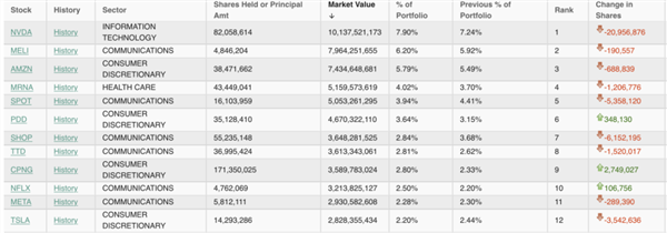 数据显示,截至2024年二季度末,柏基美股持仓的前十大重仓股为英伟达、美客多、亚马逊、莫德纳、spotify、拼多多、shopify、萃弈、coupang、奈飞。