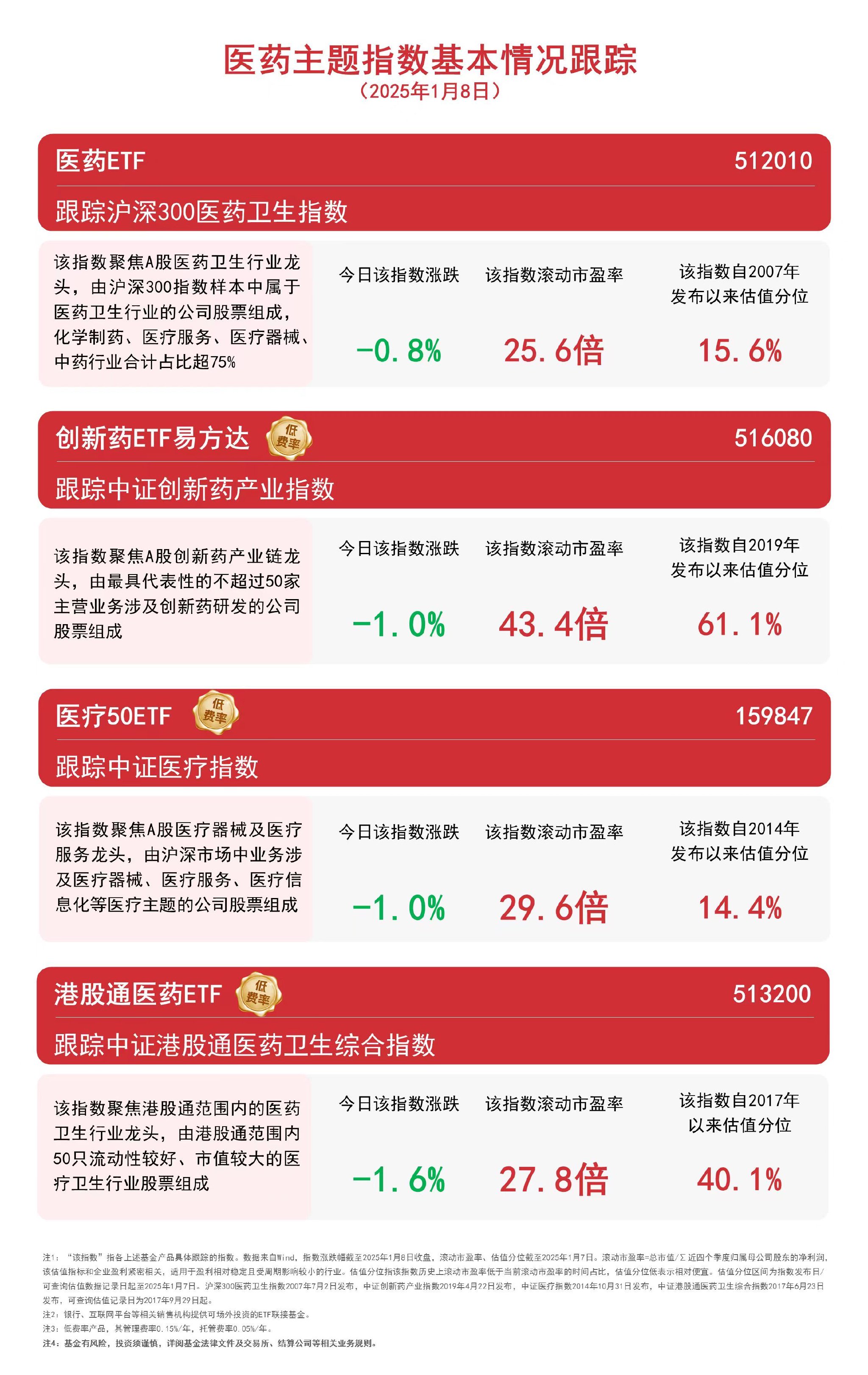 截至收盘,沪深300医药卫生指数下跌0.8%,中证创新药产业指数下跌1%,中证医疗指数下跌1%,中证港股通医药卫生综合指数下跌1.6%。