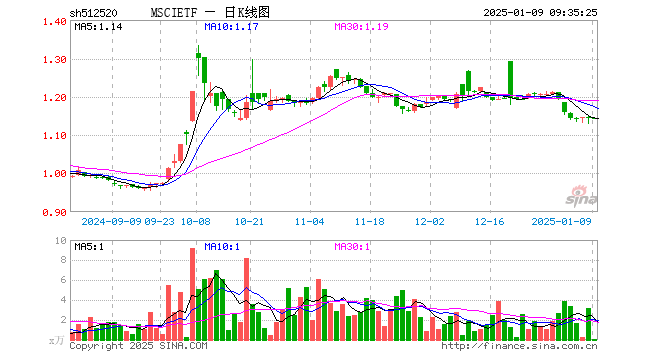 1月9日,mscietf(512520)开盘跌0.26%,报1.143元。mscietf(512520)重仓股方面,贵州茅台开盘涨0.45%,宁德时代跌1.63%,招商银行涨0.31%,长江电力跌0.21%,五粮液涨0.16%,中国平安跌0.08%,比亚迪跌0.07%,农业银行涨0.00%,兴业银行涨0.20%,工商银行涨0.00%。