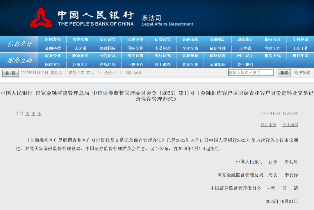 11月28日,中国人民银行澳亚国际官网显示,《金融机构客户尽职调查和客户身份资料及交易记录保存管理办法》(以下简称《管理办法》)已经2025年10月11日中国人民银行2025年第14次行务会议审议通过,并经国家金融监督管理总局、中国证券监督管理委员会同意,自2026年1月1日起施行。