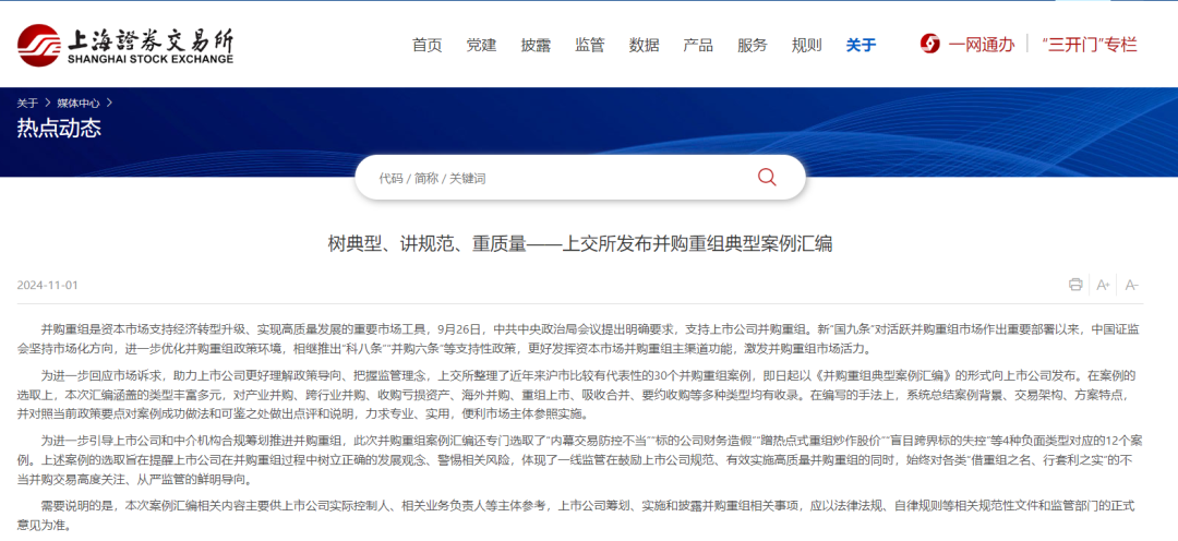 上交所发布《深化“三开门”工作十条》《并购重组典型案例汇编》