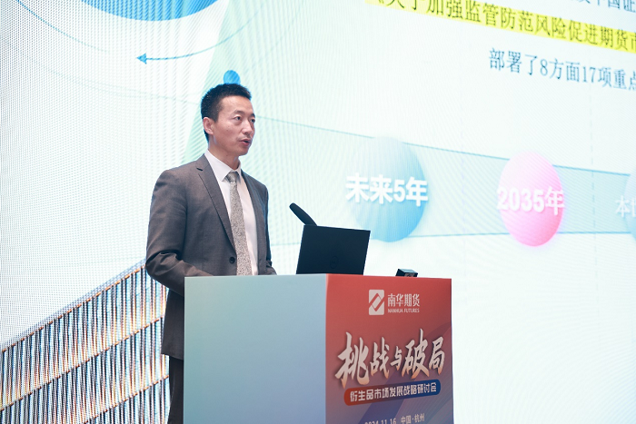 11月16日,由南华期货主办的《挑战与破局——衍生品市场发展战略研讨会》于杭州湘湖湖畔顺利举行。此次研讨会邀请了业内20多位专家学者及行业大咖,共同探讨了衍生品市场的发展趋势、战略以及行业面临的挑战,为衍生品市场的未来发展开辟了新的道路。本次会议上,南华期货股份有限公司总经理贾晓龙发表了题为《衍生品行业的发展与挑战》的主题演讲。