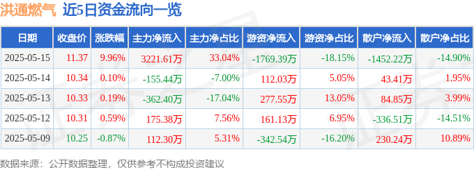 5月15日的资金流向数据方面,主力资金净流入3221.61万元,占总成交额33.04%,游资资金净流出1769.39万元,占总成交额18.15%,散户资金净流出1452.22万元,占总成交额14.9%。