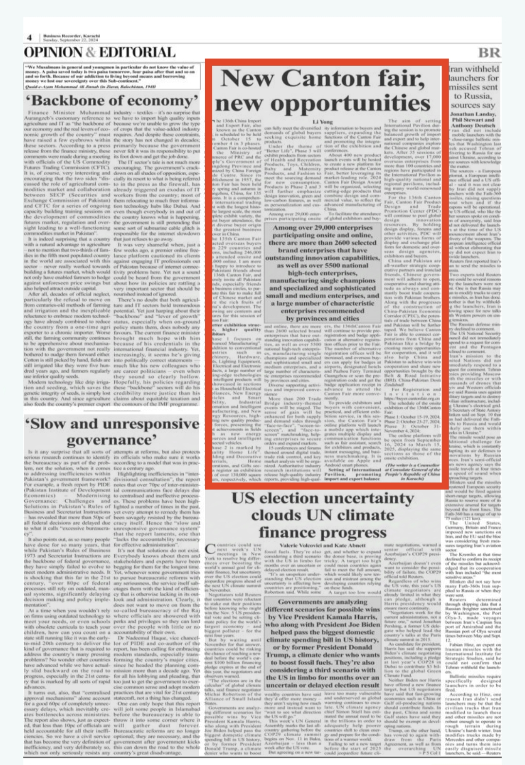 巴基斯坦《商业记录报》9月22日刊登李勇参赞署名文章new canton fair, new opportunities。2024年10月15日至11月4日,第136届广交会线下展将分三期在广州举办,李勇参赞在文章中就本届广交会的题材结构、参展商质量、配套活动等情况进行了介绍,并就广交会设立的进口展会进行了详细说明,欢迎巴基斯坦进出口商积极注册参与本届广交会。