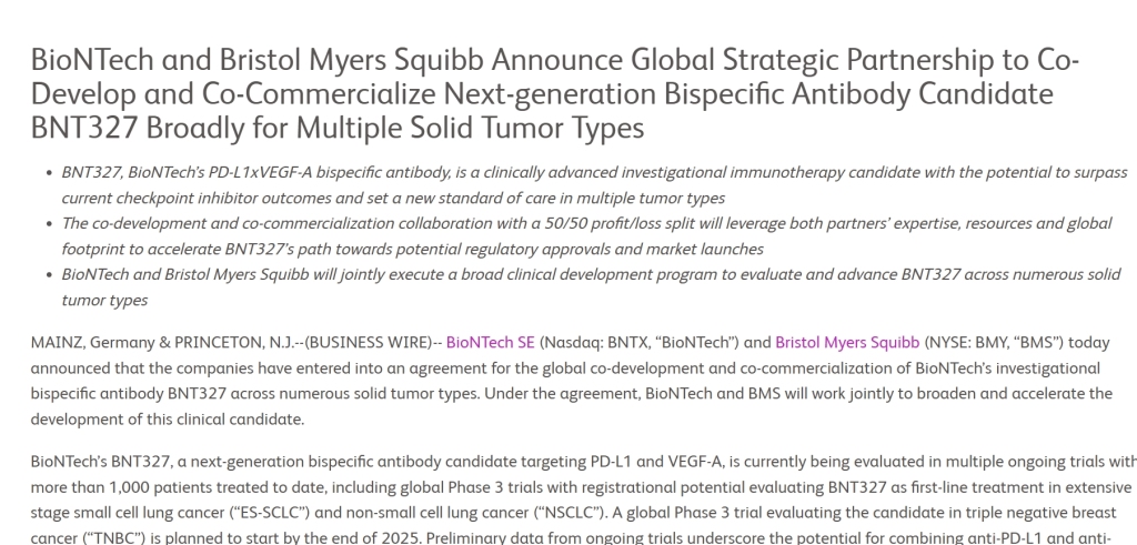 当地时间6月2日,百时美施贵宝(bms)和百欧恩泰(biontech)宣布双方已达成协议,将在全球范围内共同开发和商业化百欧恩泰的双特异性抗体候选药物bnt327。bnt327是一种针对pd-l1和vegf-a的双抗药物,有潜力用于多种实体瘤的治疗。根据协议,bms将向百欧恩泰支付15亿美元的首付款,并在2028年前支付总计20亿美元的非或有性周年付款(non-contingent anniversary payments)。这些可抵扣税款的费用将在发生时被记录为已收购的ipr&d(科学研究与试验发展)费用,其中15亿美元将在第二季度入账。此外,百欧恩泰将有资格获得高达76亿美元的额外开发、监管和商业里程碑付款。按此计算,这次交易的总金额超过90亿美元。