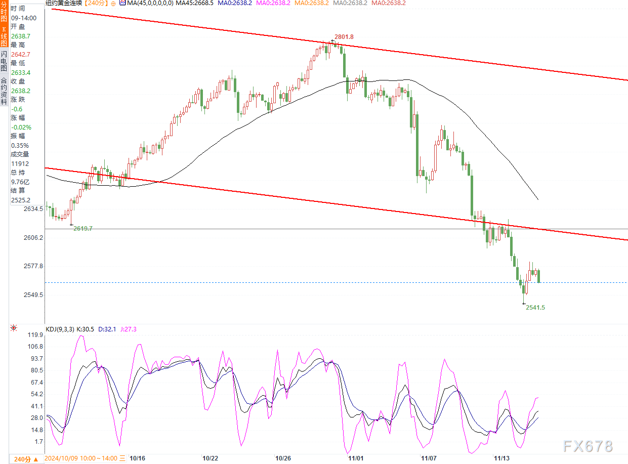 周五(11月15日)亚盘尾盘时段,comex黄金交投于2561.30美元附近,基本面上昨日美国初请失业金人数低于预期,