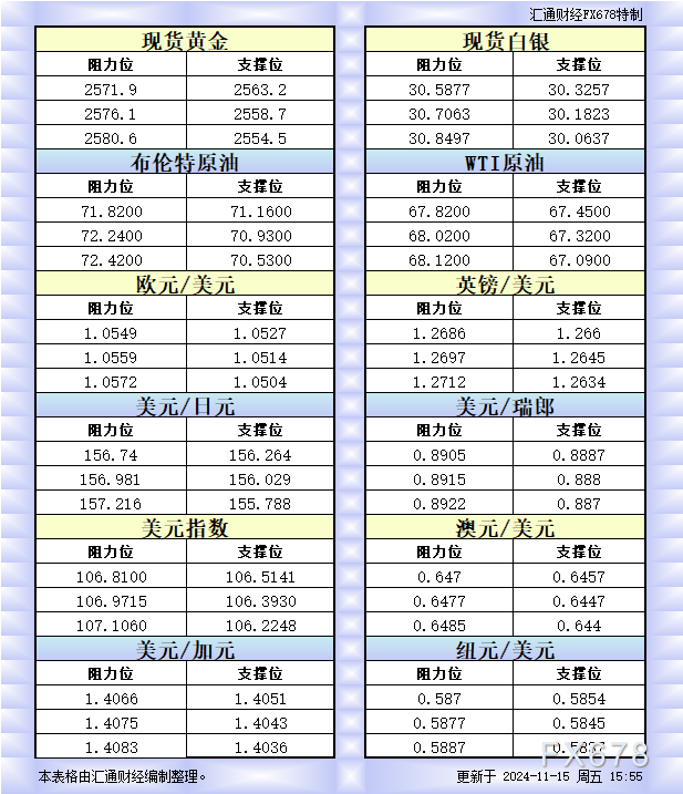 11月15日讯—— 11月15日美市更新的黄金、白银、原油、美元指数、欧元、英镑、日元、瑞郎、澳元、加元、纽元支撑阻力位一览。...