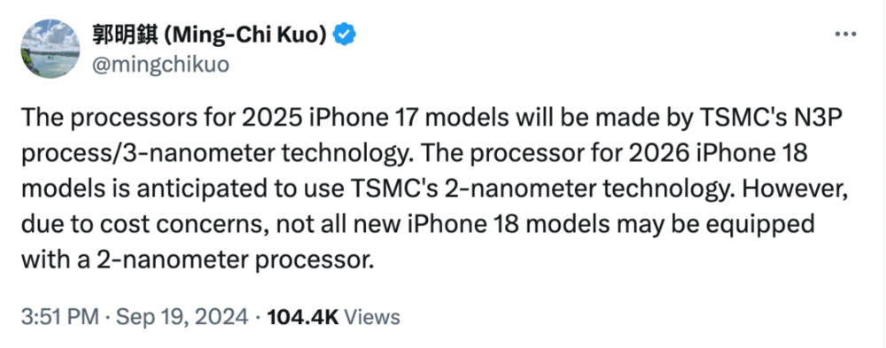 苹果自去年的a17 pro芯片开始,就率先使用了3nm工艺。今年的a18和a18 pro则更进一步,分别采用的是台积电n3e和n3p工艺。据天风国际分析师郭明錤的推文透露,苹果2025年iphone 17的处理器a19 pro芯片,将继续采用台积电的n3p工艺/3纳米技术制造。2026年iphone 18型号的处理器预计将使用台积电的2纳米技术。然而,出于成本方面的考虑,并非所有新款iphone 18都将配备2纳米处理器。