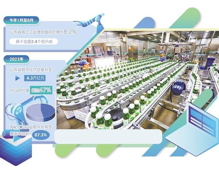 山东将制造业数字化提标行动作为产业数字化“八大行动”之首,实数融合发展不断取得新突破,制造业数字化转型先发优势全面拓展。今年1月至8月,全省规上工业增加值同比增长8.2%,高于全国2.4个百分点。2023年,全省数字经济总量升至4.3万亿元,占gdp比重超过47%,核心产业增加值占比达8.6%;全省规上工业企业数字化转型覆盖率达到87.3%;“两化”融合发展水平达67.5%,产业数字化指数、制造业数字化转型指数均居国内前列。